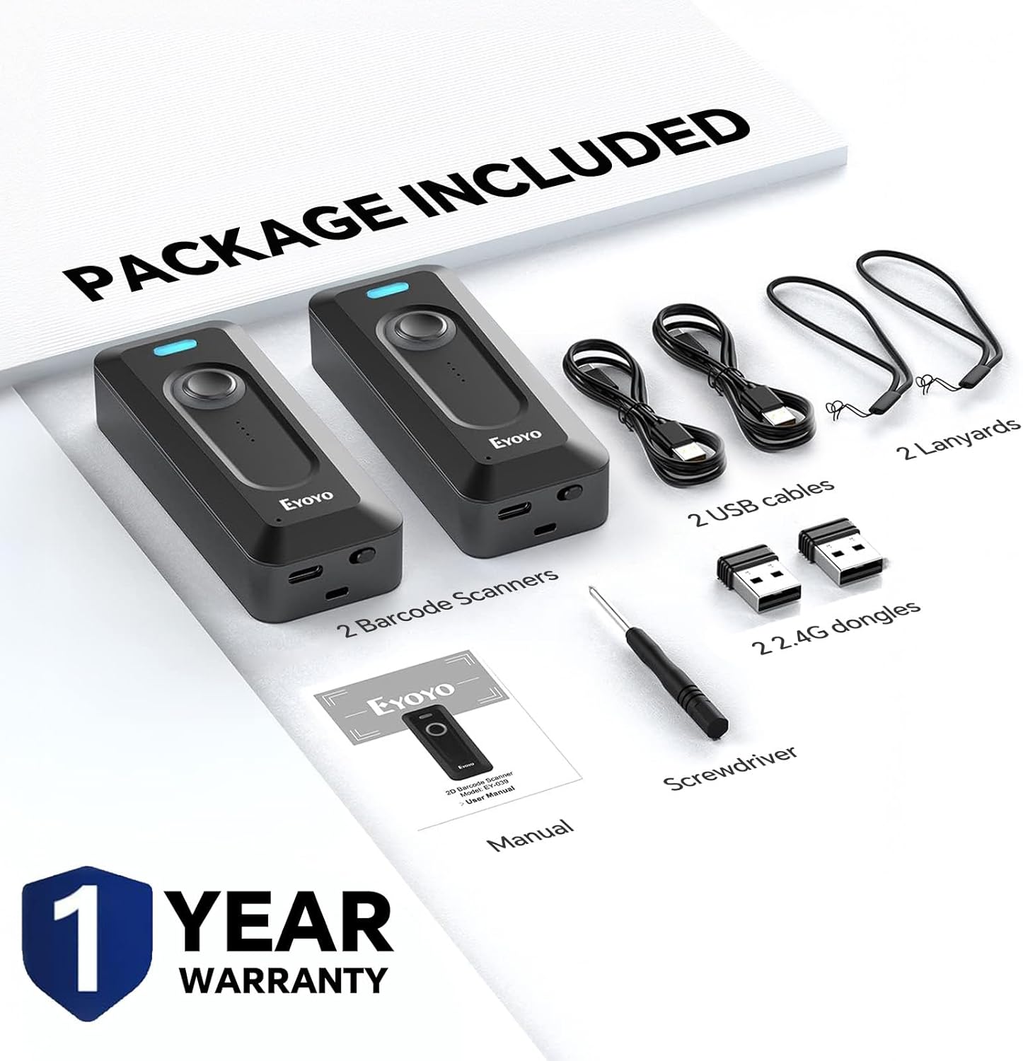2-Pack Eyoyo 2D Bluetooth Barcode Scanner Wireless with Clip, 2000mAh Battery with Level Indicator, Portable Mini Barcode Reader for Library Inventory Compatible with iPhone, iPad, Android Phone