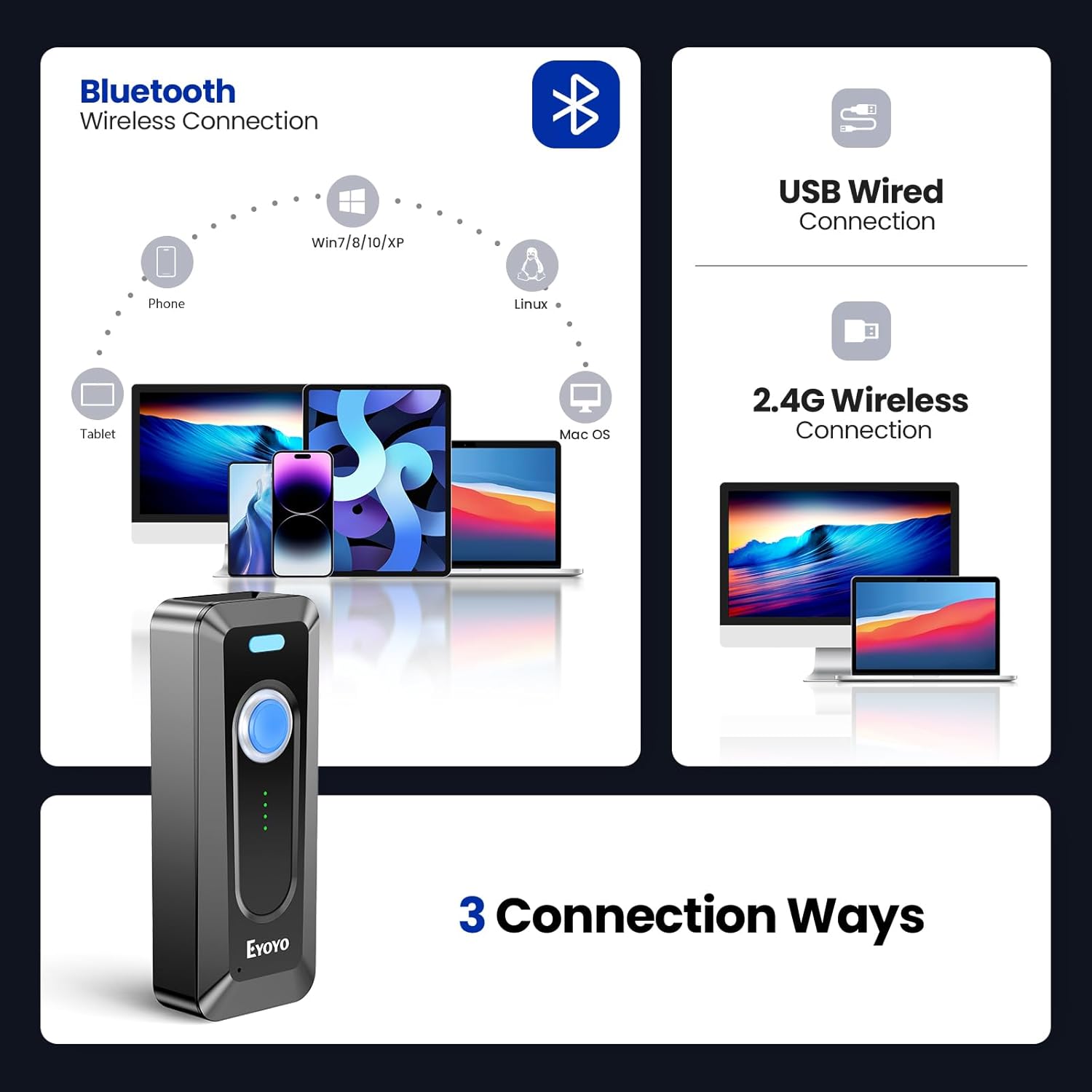 5.Bluetooth & 2.4G Wireless & USB Wired 3-in-1 Connection